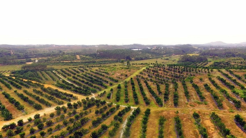 走進那呈饅頭形的山嶺,環(huán)山而植的林帶,一環(huán)扣著一環(huán)地,從山腳纏至山頂。從遠望去,恍如一個巨大的甲狀動物,蹲坐在山地間。環(huán)山種植的紅江橙,以其3×3的株行距,以一個個塔狀,立于梯間。已經成熟待收的紅江橙,一串串地掛滿枝梢。果壓樹枝,而使枝杈下垂。從遠處看,恍如珍珠爬上樹梢,如火球在泛紅,如火點在燃放,如睡美人在仰躺,如翡翠在打點......