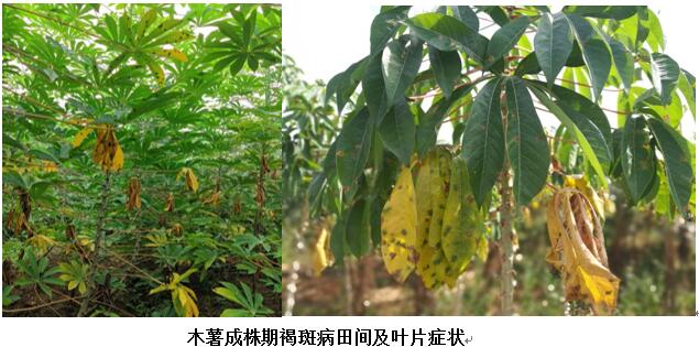 危害癥狀:病原從下層葉片開(kāi)始入侵,初為水漬狀病斑,墨綠色,近圓形或不規(guī)則形,隨后擴(kuò)大并變成灰褐色。典型成熟病斑褐色,中央較深,邊緣黑褐色,病斑周圍的葉脈常出現(xiàn)輕微變色(通常為黑色)。病斑有時(shí)擴(kuò)展并匯合成不規(guī)則大斑塊。發(fā)病后期病斑中央破裂、呈穿孔狀,嚴(yán)重時(shí),葉片變黃并干枯脫落。木薯整個(gè)生長(zhǎng)期均可受其危害。