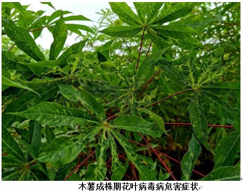 危害癥狀:感病葉片初為褪綠斑點(diǎn),逐漸擴(kuò)大,整片葉呈花葉狀;嚴(yán)重時(shí)葉片變小,背面有時(shí)可見(jiàn)突起,葉片中部和基部常收縮成蕨葉狀,受侵染葉片癥狀嚴(yán)重程度隨季節(jié)、栽培品種不同而異。在涼爽的雨季,病害癥狀表現(xiàn)最嚴(yán)重,夏季常隱癥或淺花葉。煙粉虱是田間傳播的主要介體。