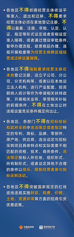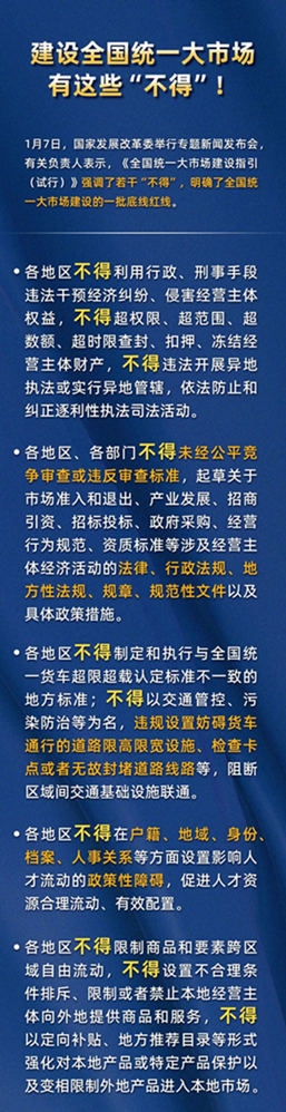 1月7日,國家發(fā)展改革委舉行專題新聞發(fā)布會,有關(guān)負(fù)責(zé)人表示,《全國統(tǒng)一大市場建設(shè)指引(試行)》強(qiáng)調(diào)了若干“不得”,明確了多方面的禁止性規(guī)定。禁止做的屬于底線紅線,如果觸碰了就要承擔(dān)相應(yīng)的責(zé)任。相關(guān)問題線索一經(jīng)核實(shí)就要限期整改,整改不到位還會通報(bào)、約談有關(guān)負(fù)責(zé)人。