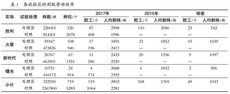 處理區(qū)內( s/ 2 d 6 +ET 割制)人均割株比對照區(qū)(s/2d5+ET 割制)平均多 521 株,效率增幅22.84%;比處理區(qū) 2015 年(s/2d4+ET 割制時)平均多 1033 株,增幅達 58.40%,有效地提高了勞動效率。處理區(qū) 2017 年(s/2d6+ET 割制)比2015 年(s/2d4+ET 割制)減少膠工 49 人,減幅為 29.17%;處理區(qū)人均割樹位達 6 個,比對照區(qū)人均割樹位多 1 個,較大幅度地減少了膠工人數(shù)。在試驗過程中,2015 年各農場推廣s/2d4+ET割制,到 2016年各農普遍場推廣了 s/2d5+ET 割制,說明農場人均割株在逐年增加,也在不斷擴崗,對緩解膠工短缺問題具有積極的作用。