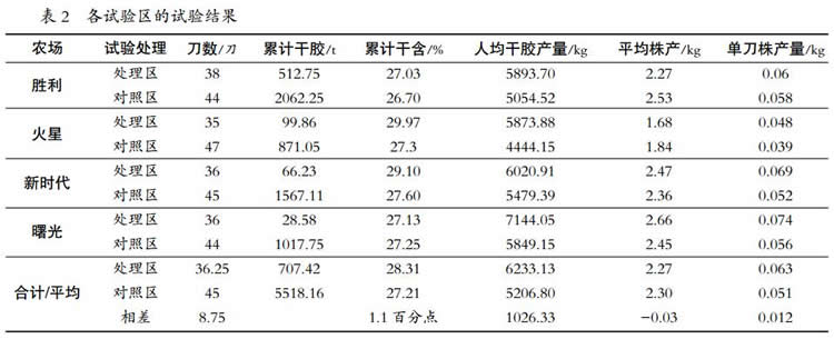 處理區(qū)平均株產干膠 2.27 kg,比對照低 0.03 kg/株,減幅 1.30%;處理區(qū)平均單刀產干膠 0.063 kg/(株·刀),比對照高 0.012 kg/(株·刀),增幅 23.53%(表 2)。