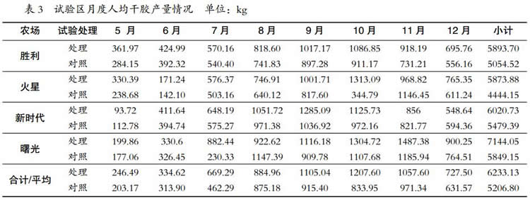 各處理區(qū)人均干膠產量比對照區(qū)高 1 t 以上的生產隊有 8 個,占處理區(qū)生產隊個數(shù)的 53.33%;人均干膠產量超過 6 t 的生產隊有 6 個,占處理區(qū)生產隊個數(shù)的 40%;人均干膠產量超過 7 t 的生產隊有 3 個,占處理區(qū)生產隊個數(shù)的 20%;人均干膠產量最高的為勝利農場路口隊,達 7471.33 kg/人。