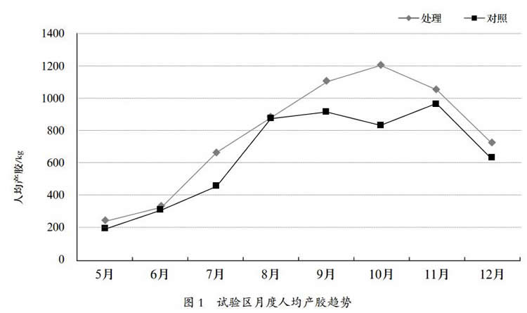 收集每刀數(shù)據(jù),規(guī)范數(shù)據(jù)收集的表格。收集的數(shù)據(jù)包括開割時間、刀次、膠水產量、干膠產量、干含、人均產量及涂藥濃度等,每一個月匯總一次數(shù)據(jù),并及時跟蹤試驗基地的情況。收集膠工報酬標準與收入數(shù)據(jù), 以全場為對照區(qū),對產膠數(shù)據(jù)進行