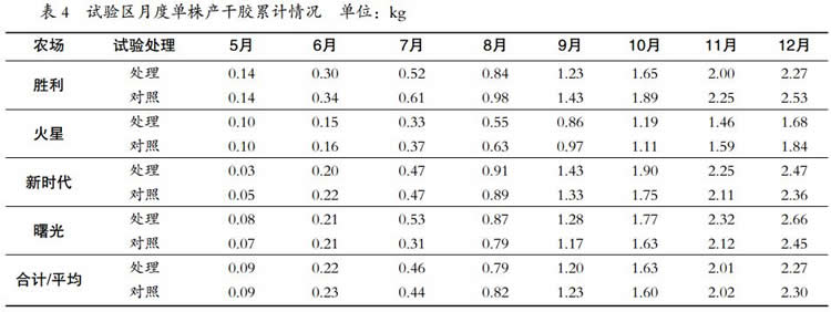 5—12 月處理區(qū)與對照的單株干膠產量累計都相差不大;6 月、7 月單株干膠產量累計分別比上月增加幅度均較小,8 月、9 月、10 月和11 月單株干膠產量累計分別比上月增加幅度均較大,12 月單株干膠產量累計比上月增加幅度較小(表 4)。