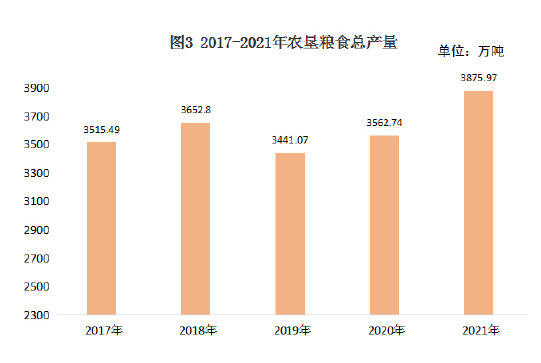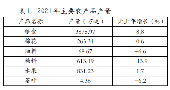 糧食總產(chǎn)量3875.97萬噸,比上年增加313.23萬噸,增長8.8%(見圖3)。主要農(nóng)產(chǎn)品產(chǎn)量見表1。