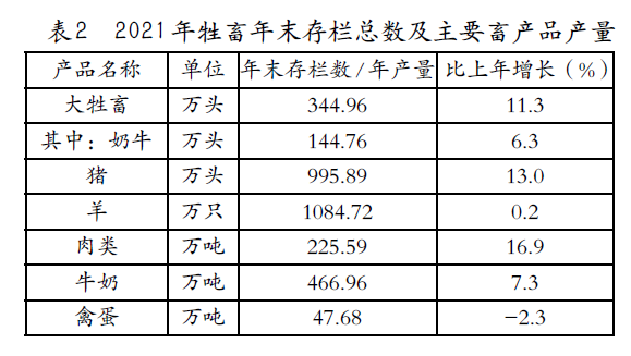 畜牧業(yè)占農(nóng)林牧漁業(yè)總產(chǎn)值比重21.6%,比上年減少1.3個百分點。牲畜年末存欄總數(shù)及主要畜產(chǎn)品產(chǎn)量見表2。