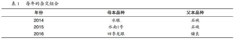 通過 2014—2016 年連續(xù) 3 年不同龍眼品種雜交試驗表明(表 1):以多效唑處理水眼、水南一號、四季龍眼等品種后,一周內(nèi)大量雌花開,雌花集中開放時授粉 1 次即可,為了確保授粉效果可第二天再授粉 1 次。傳統(tǒng)雜交:水眼 2014 年 4 月 4 日開始去雄,4 月 7 日零星雌花開,到 4 月 9 日大量雌花開,開始采集花粉授粉到完成授粉,前后需要耗時 6 d;水南一號 2015 年 3 月 31 日開始去雄,4 月 2 日零星雌花開,4 月 4 日大量雌花開,采集花粉完成授粉需要耗時 5 d;四季龍眼 2016 年 4 月 20 日開始去雄,4 月 22 日大量雌花開,從開始采集花粉授粉到授粉完成,耗時 4 d。果實成熟時調(diào)查傳統(tǒng)雜交授粉與改良雜交授粉的單穗果粒數(shù)。2014 年,傳統(tǒng)雜交授粉的平均單穗果粒數(shù) 10.6 粒,改良雜交授粉的平均單穗果粒數(shù) 19.2 粒,比傳統(tǒng)雜交授粉的坐果率提高 81.13%;2015 年,傳統(tǒng)雜交授粉的平均單穗果粒數(shù) 5.2 粒,改良雜交授粉的平均單穗果粒數(shù) 16.1 粒,比傳統(tǒng)雜交授粉的坐果率提高 209.6%;2016 年,傳統(tǒng)雜交授粉的平均單穗果粒數(shù) 9.5 粒,改良雜交授粉的平均單穗果粒數(shù) 21.4 粒,比傳統(tǒng)雜交授粉的坐果率提高 125.3%;