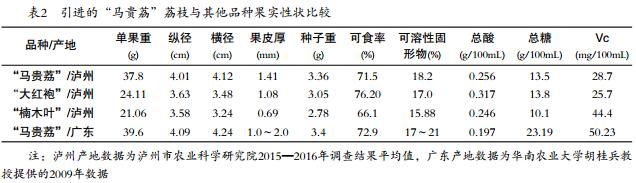 2013—2016年的調(diào)查數(shù)據(jù)顯示,引進(jìn)的“馬貴荔”荔枝與瀘州“大紅袍”荔枝嫁接親和性好,表現(xiàn)適應(yīng)瀘州地區(qū)氣候環(huán)境,高接換種后樹體生長好,易成花結(jié)果,較豐產(chǎn)。引進(jìn)的“馬貴荔”荔枝主要物候期均晚于瀘州地區(qū)主栽的“大紅袍”荔枝和晚熟的“楠木葉”荔枝,果實(shí)成熟期較“大紅袍”荔枝晚30d左右,較“楠木葉”荔枝晚7d左右。引進(jìn)的“馬貴荔”荔枝銷售時間錯開了瀘州荔枝上市高峰期,延長了瀘州荔枝上市時間,對擴(kuò)大瀘州地區(qū)荔枝晚熟優(yōu)勢有所幫助。引進(jìn)的“馬貴荔”荔枝銷售價格連續(xù)3年高于當(dāng)?shù)刂髟缘摹按蠹t袍”荔枝和晚熟的“楠木葉”荔枝,商品價值較高。與原產(chǎn)地相比,引進(jìn)的“馬貴荔”荔枝在主要果實(shí)性狀和品質(zhì)上基本保持了原有的優(yōu)良特性,并優(yōu)于瀘州地區(qū)主栽的“大紅袍”荔枝和晚熟的“楠木葉”荔枝。但與“帶綠”“紅繡球”等優(yōu)質(zhì)晚熟荔枝相比,“馬貴荔”荔枝在品質(zhì)上還存在某些方面的不足,如核大、成熟后味道容易變淡等。從綜合性狀看,“馬貴荔”荔枝適合在瀘州荔枝優(yōu)勢發(fā)展區(qū)進(jìn)行適量推廣應(yīng)用,其特遲熟等特性將為瀘州地區(qū)荔枝雜交育種提供一份難得的種質(zhì)資源。