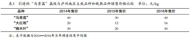 2014—2016年,引進(jìn)的“馬貴荔”荔枝平均銷售價格分別為40元/kg、30元/kg和40元/kg。與瀘州地區(qū)主栽品種和晚熟品種相比,2014年引進(jìn)的“馬貴荔”荔枝平均銷售價格為“大紅袍”荔枝的2.0倍、“楠木葉”荔枝的1.3倍;2015年引進(jìn)的“馬貴荔”荔枝平均銷售價格為“大紅袍”荔枝的2.5倍、“楠木葉”荔枝的1.5倍;2016年引進(jìn)的“馬貴荔”荔枝平均銷售價格為“大紅袍”荔枝的2.5倍、“楠木葉”荔枝的1.3倍。可見“馬貴荔”荔枝引進(jìn)瀘州后,連續(xù)3年銷售價格高于當(dāng)?shù)刂髟缘摹按蠹t袍”荔枝和當(dāng)?shù)赝硎斓摹伴救~”荔枝。