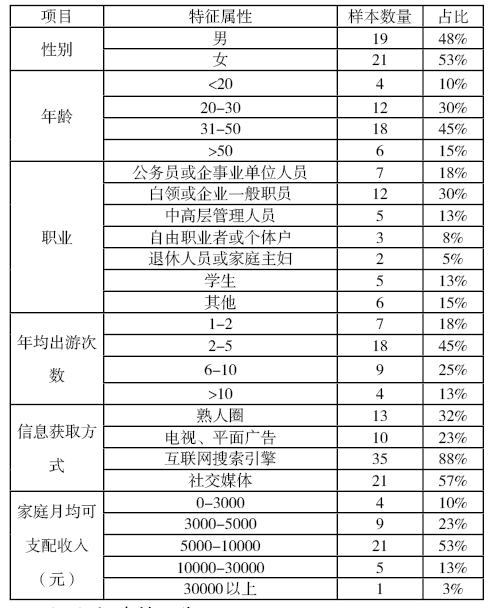 通過深度訪談形成基本的測試樣本,受訪者中,企事業(yè)單位職工和白領占48%;年均出游次數以2-5次居多,占45%;習慣利用互聯網搜索、社交媒體獲取信息?;緦傩砸娤卤怼?