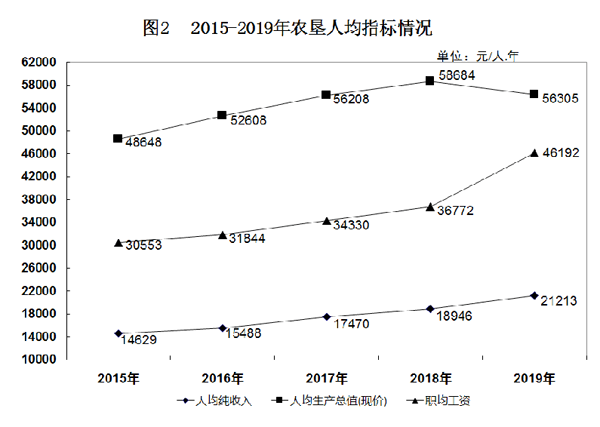 全年農(nóng)墾經(jīng)濟(jì)實(shí)現(xiàn)生產(chǎn)總值17886.25億元(見(jiàn)圖1)。其中,第一產(chǎn)業(yè)增加值1828.37億元;第二產(chǎn)業(yè)增加值3290.01億元;第三產(chǎn)業(yè)增加值2767.87億元。第一、第二、第三產(chǎn)業(yè)增加值占農(nóng)墾生產(chǎn)總值的比重分別為23.2%、41.7%和35.1%。人均生產(chǎn)總值56305元;人均可支配收入持續(xù)增長(zhǎng),達(dá)到21213元,比上年增長(zhǎng)12%(見(jiàn)圖2)。