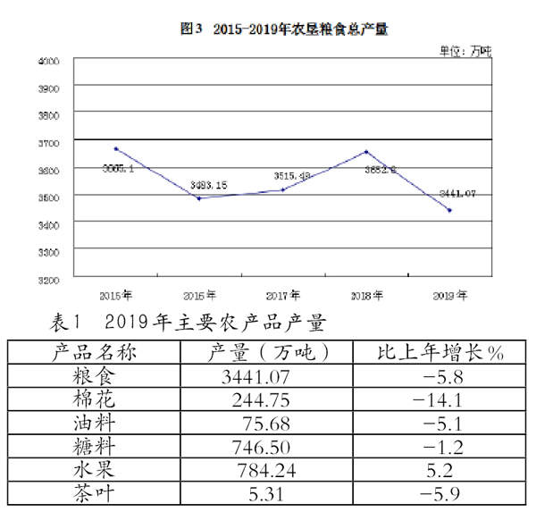 糧食總產(chǎn)量23441.07萬(wàn)噸,比上年減少211.73萬(wàn)噸,下降5.8%(見(jiàn)圖3)。主要農(nóng)產(chǎn)品產(chǎn)量見(jiàn)表1。