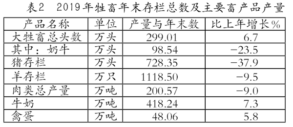 畜牧業(yè)占農(nóng)業(yè)總產(chǎn)值比重23.0%,比上年增長(zhǎng)2.6個(gè)百分點(diǎn)。牲畜年末存欄總數(shù)及主要畜產(chǎn)品產(chǎn)量見(jiàn)表2。
