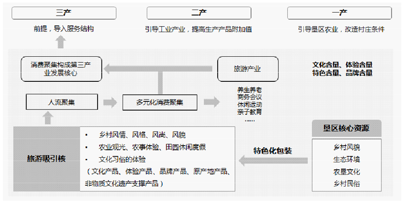 農(nóng)墾系統(tǒng)的“321”全產(chǎn)業(yè)鏈發(fā)展模式,強調(diào)三產(chǎn)之間的互動效率和產(chǎn)業(yè)能力提升。這一模式以墾區(qū)核心資源的分析挖掘為起點,通過對資源的特色化、產(chǎn)品化包裝形成旅游產(chǎn)業(yè)的吸引核,以聚集人氣,形成旅游引導的消費聚集,并引致消費產(chǎn)業(yè)的就業(yè)供給側(cè)聚集,形成以旅游產(chǎn)業(yè)為核心的三產(chǎn)服務結(jié)構(gòu),進而引導加工產(chǎn)業(yè)發(fā)展,帶動墾區(qū)農(nóng)業(yè)發(fā)展方式轉(zhuǎn)型升級。